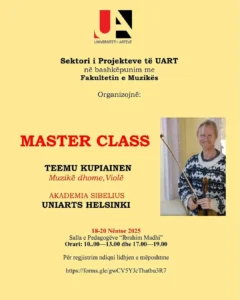Në kuadër të zhvillimit të marrëdhënieve të bashkëpunimit të Universitetit të Arteve dhe Fakultetit të Muzikës me institucione homologe evropiane, në datat 18-20 Nëntor, organizohet një Masterclass në Muzikë Dhome nën drejtimin e Teemu Kupiainen, nga Akademia “Sibelius” e UNIARTS të Helsinkit, Finlandë.