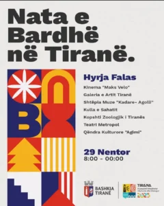Nga ora 8:00 – 00:00, të gjitha institucionet artistike hapin dyert falas – muze, teatro, galeri dhe aktivitete speciale, përveç festave që zhvillohen në sheshet kryesore të kryeqytetit. 🇦🇱