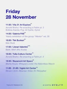From 𝐍𝐨𝐯𝐞𝐦𝐛𝐞𝐫 𝟐𝟕–𝟑𝟎, Tirana transforms into a city-wide gallery, alive with exhibitions, urban interventions, performances, readings, screenings, talks, music, and so much more!