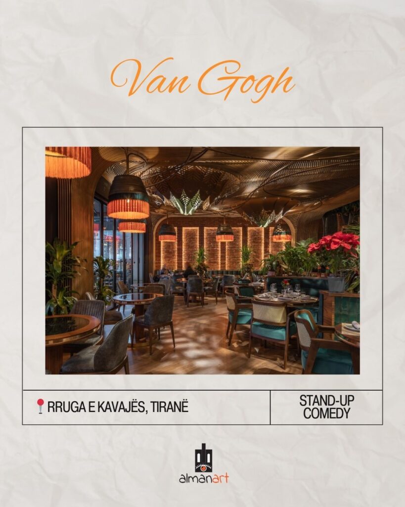 Një nga lokalet më të njohura të natës në Tiranë, “Van Gogh” shpesh pret evente të ndryshme kulturore, përfshirë edhe netët e stand-up comedy. Një vend perfekt për të shijuar një pije të mirë dhe të qeshura të garantuara.